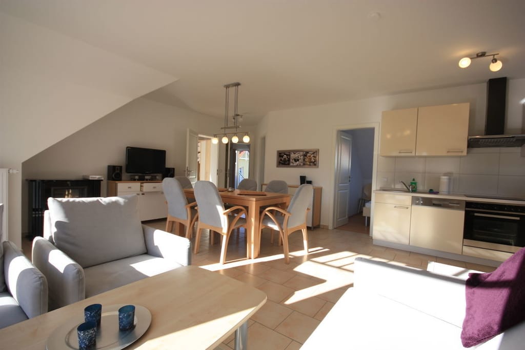 Diese Wohnung wurde 2010 gebaut und wird ab Frühjahr 2011 vermietet. Die Einrichtung ist sehr hochwertig gehalten. Die Ferienwohnung verfügt über einen großen Balkon mit Sonnenliege und bietet zwei getrennte Schlafzimmer, eines mit Doppelbett und eines mit zwei Einzelbetten, die bei Bedarf zusammengestellt werden können. Ein Flachbilsfernseher, DVD, CD und ein Elektrokamin sorgen im Wohnzimmer auch an kalten Tagen für Gemütlichkeit. Die Küche ist vollständig ausgestattet und verfügt neben einer Spülmaschine auch über einen Backofen.