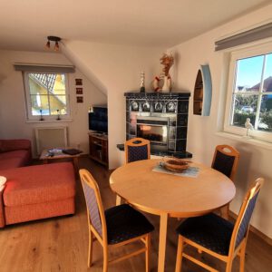 Die Wohnung ist im modernen Landhausstil mit Laminatboden und weiß/brauner Möblierung gehalten. Die Inneneinrichtung wurde 2014 komplett renoviert. Die Wohnung verfügt über ein Schlafzimmer mit Doppelbett und ein Schlafzimmer mit Etagenbett. Die Wohnung ist ideal geeignet für Familien und Hundeliebhaber.