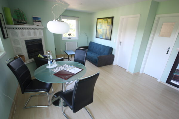 Die Wohnung ist analog zu Segeln und Rumpf der Namensgeberin in weiß-grün-schwarz gehalten. Alle Möbel und Einrichtungsgegenstände zeigen sich in einer geschmackvoll aufeinander abgestimmten Komposition und unterstreichen die Ruhe und Behaglichkeit ausstrahlende Gesamteinrichtung. Ein Elektrokachelkamin im großen Wohnzimmer sorgt auch an kälteren Tagen für ein hohes Wohlfühlgefühl, so daß Sie sich schon nach kurzer Zeit wie zu Hause fühlen werden. Die Wohnung ist optimal für Paare oder Reisepartner geeignet. Durch das große Wohnzimmer mit Kamin und Dachschrägen ist die Wohnung auch die Wahl zum „Überwintern“.